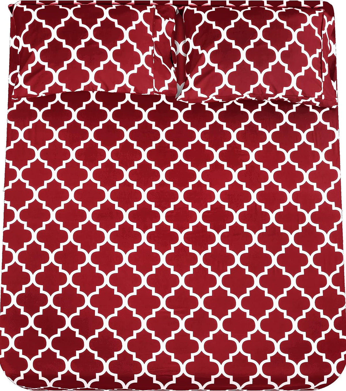 Cymak Bedding Printed Queen Sheet Set - 1 Fitted Sheet, 1 Flat Sheet and 2 Pillowcases - Soft Brushed Microfiber Fabric - Shrinkage and Fade Resistant (Queen, Burgundy Quatrefoil with White Pattern)