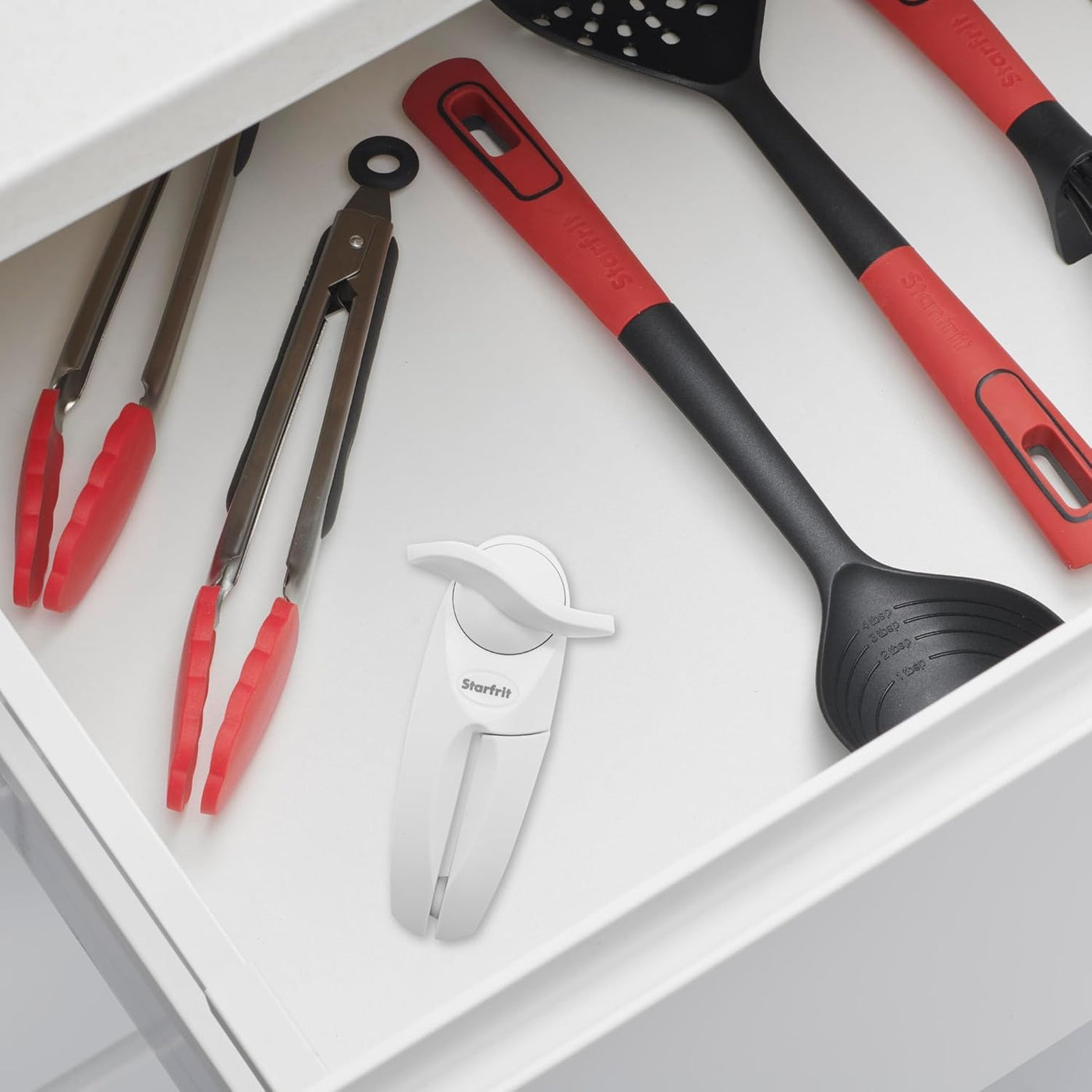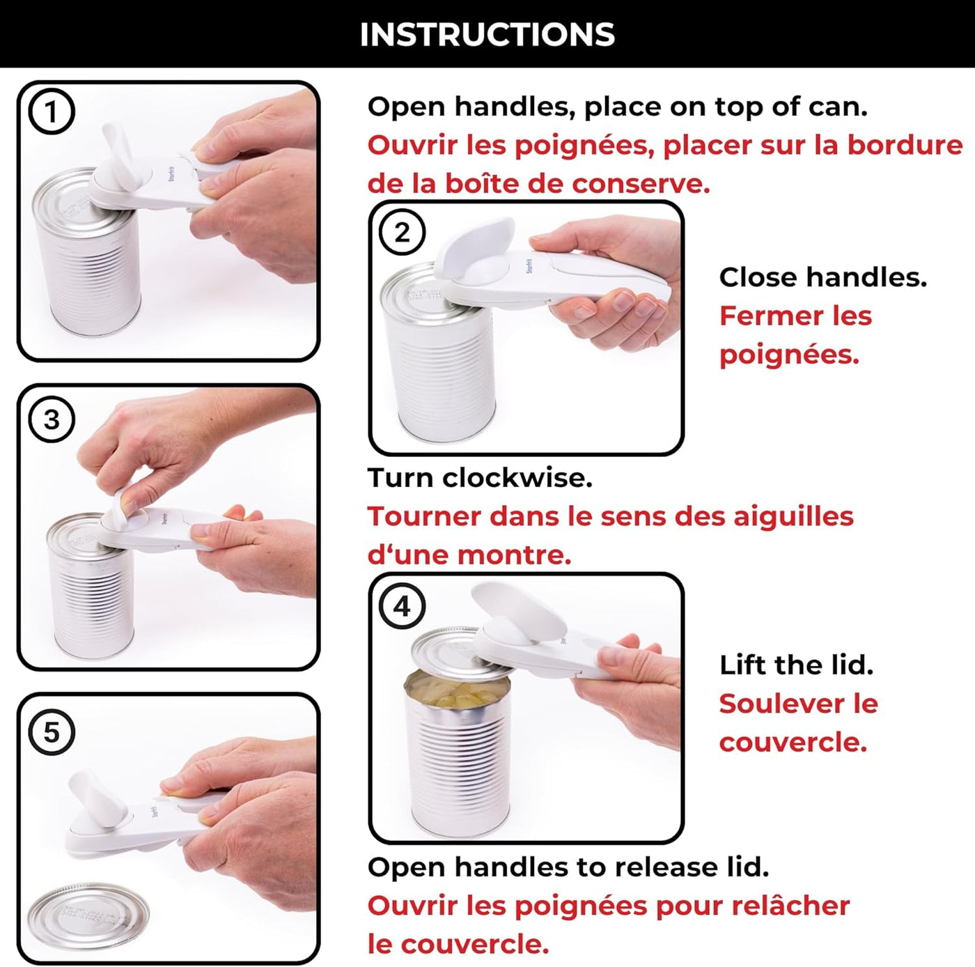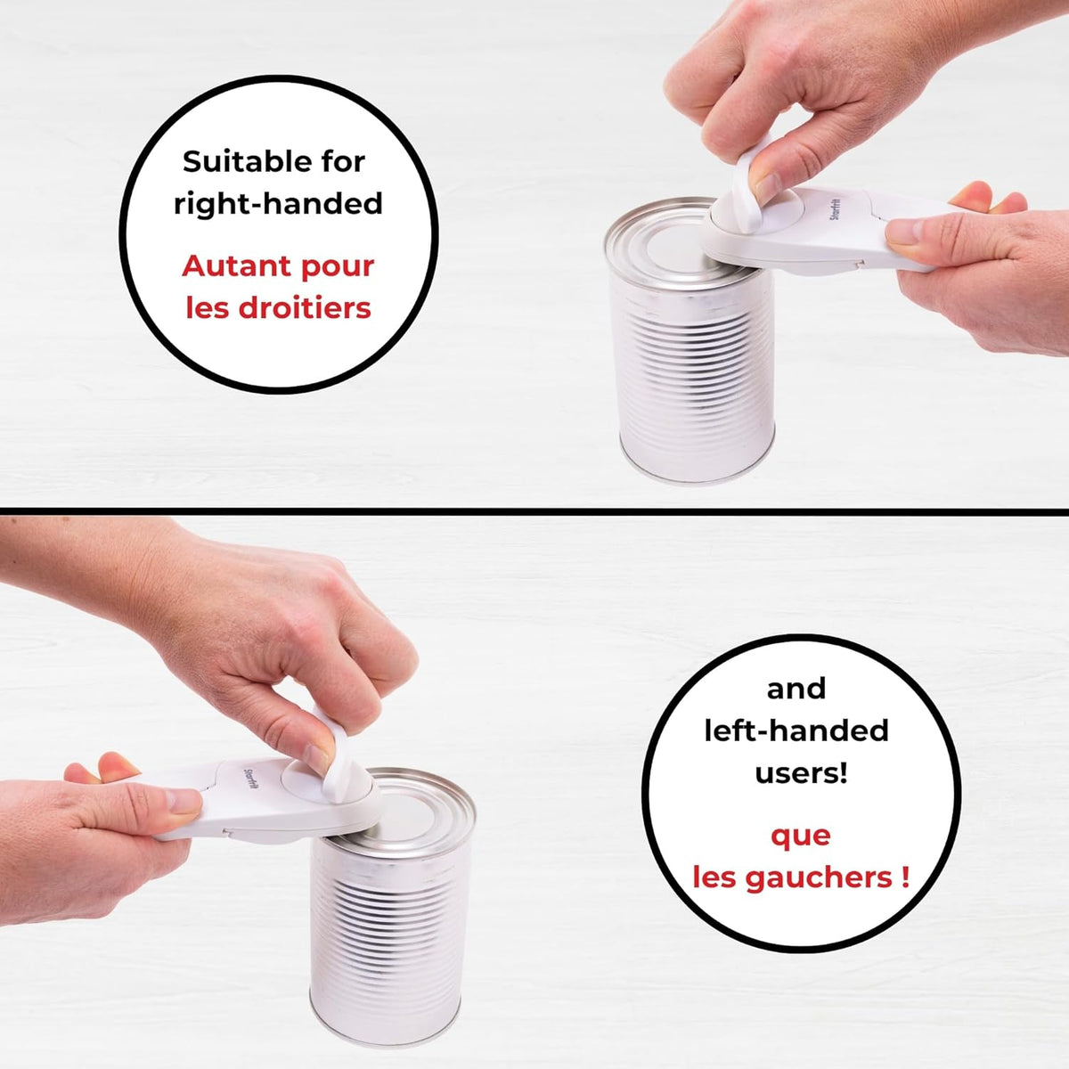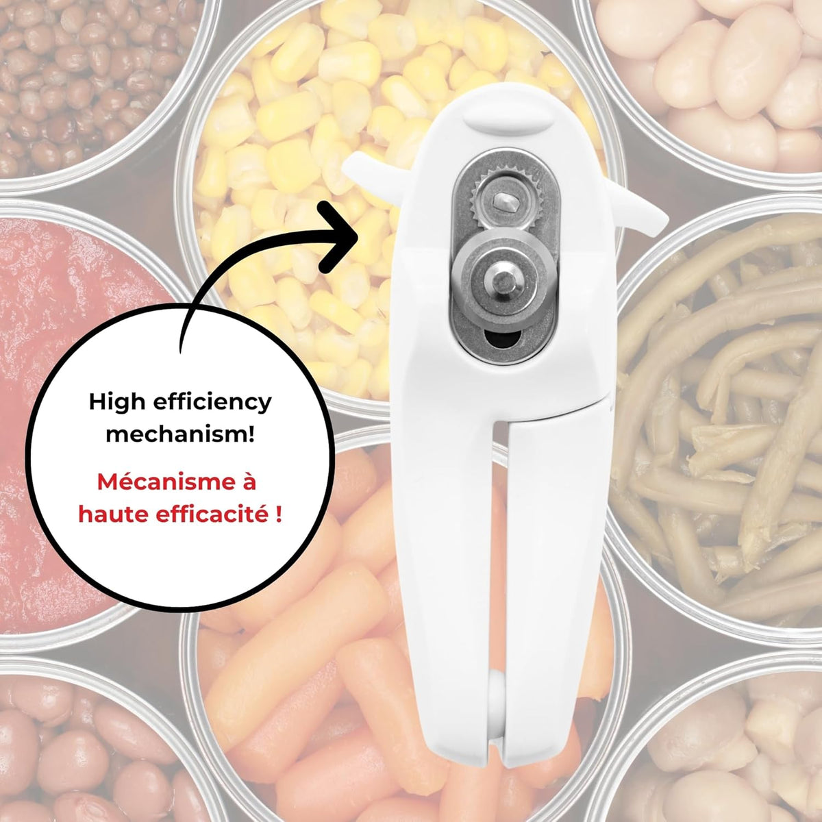 Little Beaver Can Opener - Safe - Holds Lid and Leaves No Sharp Edges on Lid - Comfort Grip - 3 year warranty - White